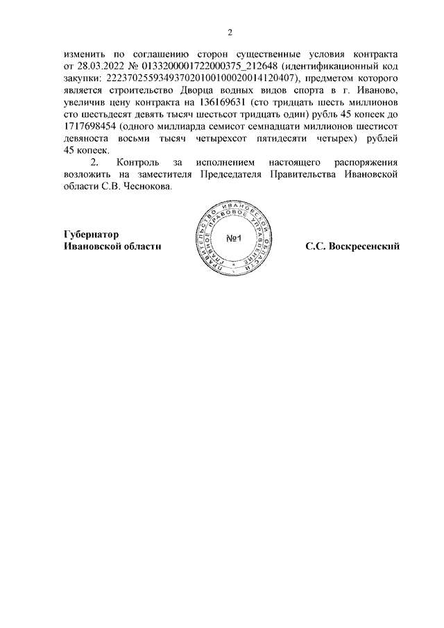 Распоряжение Правительства Ивановской области от 12.12.2023 N 226-рп "О праве государственного бюджетного учреждения, подведомственного Департаменту строительства и архитектуры Ивановской области, изменить по соглашению сторон существенные условия контракта, предметом которого является выполнение работ по строительству объекта капитального строительства"
