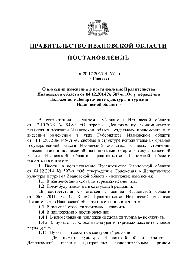 Постановление Правительства Ивановской области от 20.12.2023 N 631-п "О внесении изменений в постановление Правительства Ивановской области от 04.12.2014 N 507-п "Об утверждении Положения о Департаменте культуры и туризма Ивановской области"