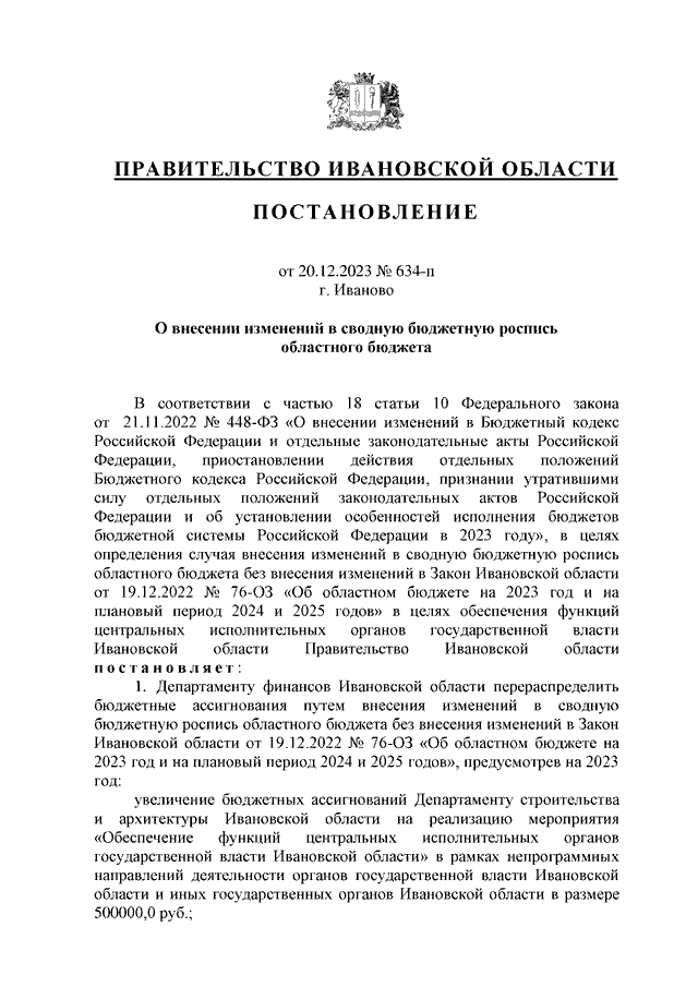 Постановление Правительства Ивановской области от 20.12.2023 N 634-п "О внесении изменений в сводную бюджетную роспись областного бюджета"