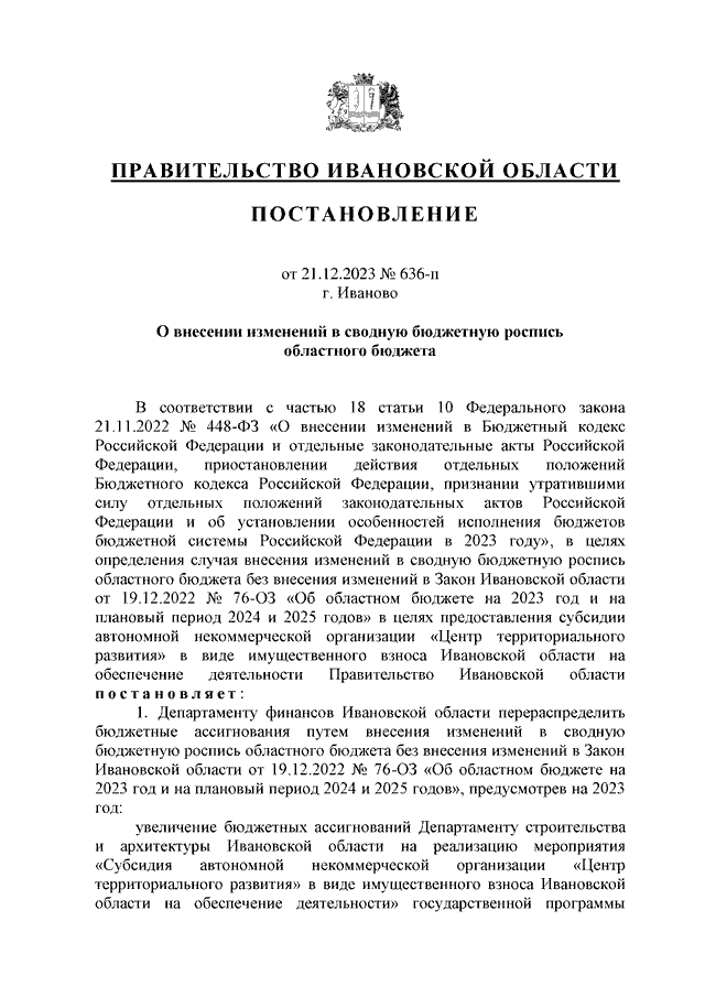 Постановление Правительства Ивановской области от 21.12.2023 N 636-п "О внесении изменений в сводную бюджетную роспись областного бюджета"