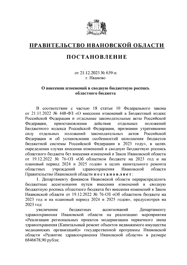 Постановление Правительства Ивановской области от 21.12.2023 N 639-п "О внесении изменений в сводную бюджетную роспись областного бюджета"