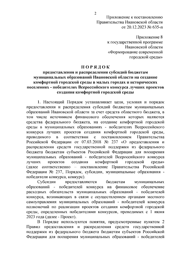 Постановление Правительства Ивановской области от 20.12.2023 N 635-п "Об установлении расходного обязательства и о внесении изменения в постановление Правительства Ивановской области от 01.09.2017 N 337-п "Об утверждении государственной программы Ивановской области "Формирование современной городской среды" (вместе с "Порядком предоставления и распределения субсидий бюджетам муниципальных образований Ивановской области на создание комфортной городской среды в малых городах и исторических поселениях - победителях Всероссийского конкурса лучших проектов создания комфортной городской среды")