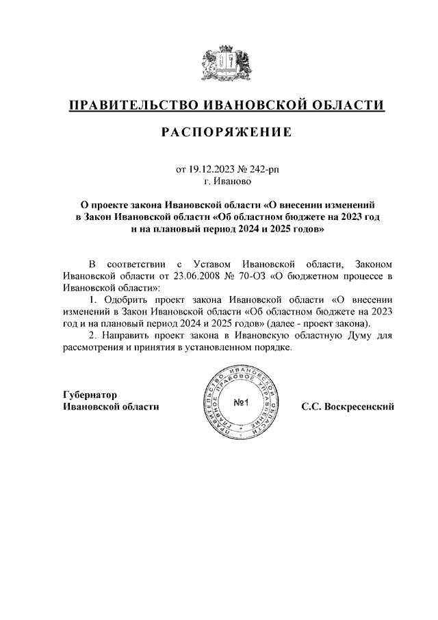 Распоряжение Правительства Ивановской области от 19.12.2023 N 242-рп "О проекте закона Ивановской области "О внесении изменений в Закон Ивановской области "Об областном бюджете на 2023 год и на плановый период 2024 и 2025 годов"