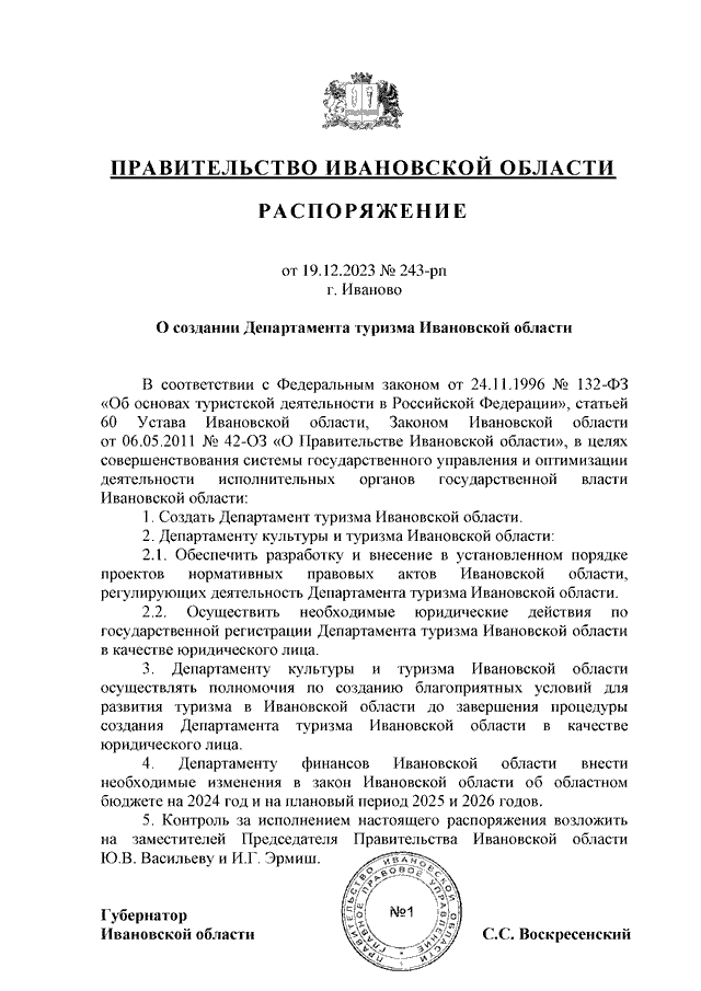 Распоряжение Правительства Ивановской области от 19.12.2023 N 243-рп "О создании Департамента туризма Ивановской области"