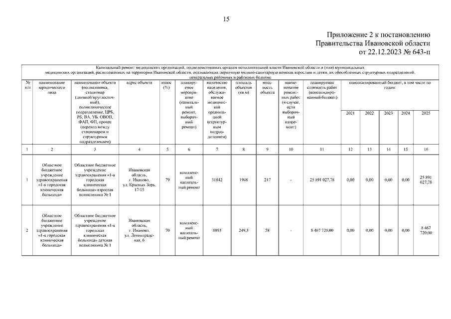 Постановление Правительства Ивановской области от 22.12.2023 N 643-п "О внесении изменений в постановление Правительства Ивановской области от 15.12.2020 N 626-п "Об утверждении Региональной программы модернизации первичного звена здравоохранения Ивановской области на 2021 - 2025 годы"
