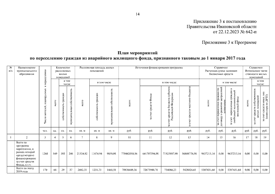 Постановление Правительства Ивановской области от 22.12.2023 N 642-п "О внесении изменений в постановление Правительства Ивановской области от 09.04.2019 N 131-п "Об утверждении региональной адресной программы "Переселение граждан из аварийного жилищного фонда на территории Ивановской области на 2019 - 2023 годы" (вместе с "Перечнем многоквартирных домов, признанных аварийными до 1 января 2017 года", "Планом реализации мероприятий по переселению граждан из аварийного жилищного фонда, признанного таковым до 1 января 2017 года, по способам переселения")