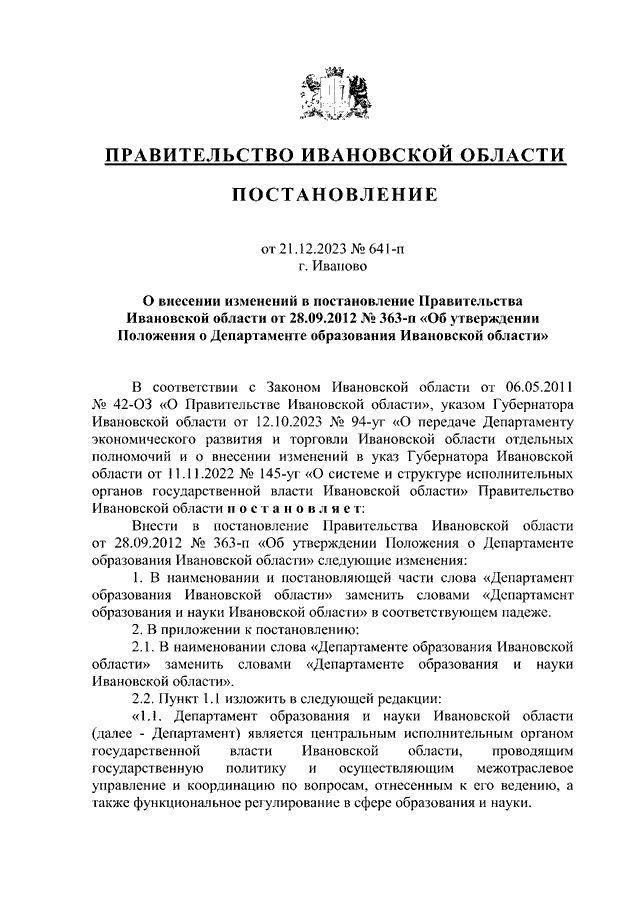 Постановление Правительства Ивановской области от 21.12.2023 N 641-п "О внесении изменений в постановление Правительства Ивановской области от 28.09.2012 N 363-п "Об утверждении Положения о Департаменте образования Ивановской области"