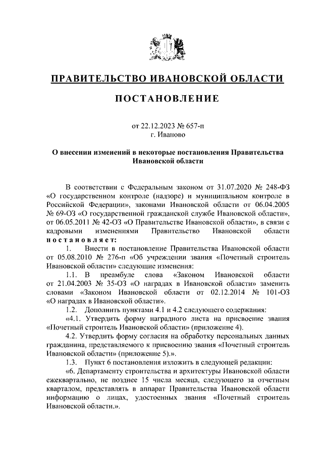 Постановление Правительства Ивановской области от 22.12.2023 N 657-п "О внесении изменений в некоторые постановления Правительства Ивановской области"