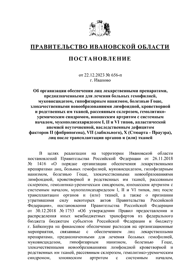 Постановление Правительства Ивановской области от 22.12.2023 N 656-п "Об организации обеспечения лиц лекарственными препаратами, предназначенными для лечения больных гемофилией, муковисцидозом, гипофизарным нанизмом, болезнью Гоше, злокачественными новообразованиями лимфоидной, кроветворной и родственных им тканей, рассеянным склерозом, гемолитико-уремическим синдромом, юношеским артритом с системным началом, мукополисахаридозом I, II и VI типов, апластической анемией неуточненной, наследственным дефицитом факторов II (фибриногена), VII (лабильного), X (Стюарта - Прауэра), лиц после трансплантации органов и (или) тканей"