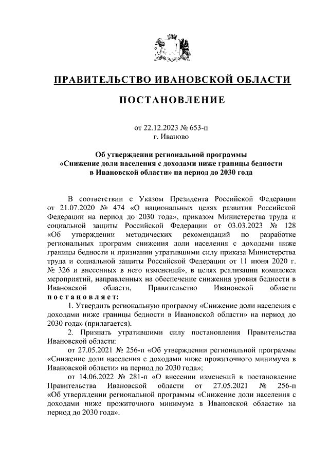 Постановление Правительства Ивановской области от 22.12.2023 N 653-п "Об утверждении региональной программы "Снижение доли населения с доходами ниже границы бедности в Ивановской области" на период до 2030 года"