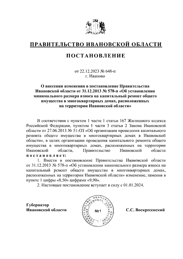 Постановление Правительства Ивановской области от 22.12.2023 N 648-п "О внесении изменения в постановление Правительства Ивановской области от 31.12.2013 N 578-п "Об установлении минимального размера взноса на капитальный ремонт общего имущества в многоквартирных домах, расположенных на территории Ивановской области"
