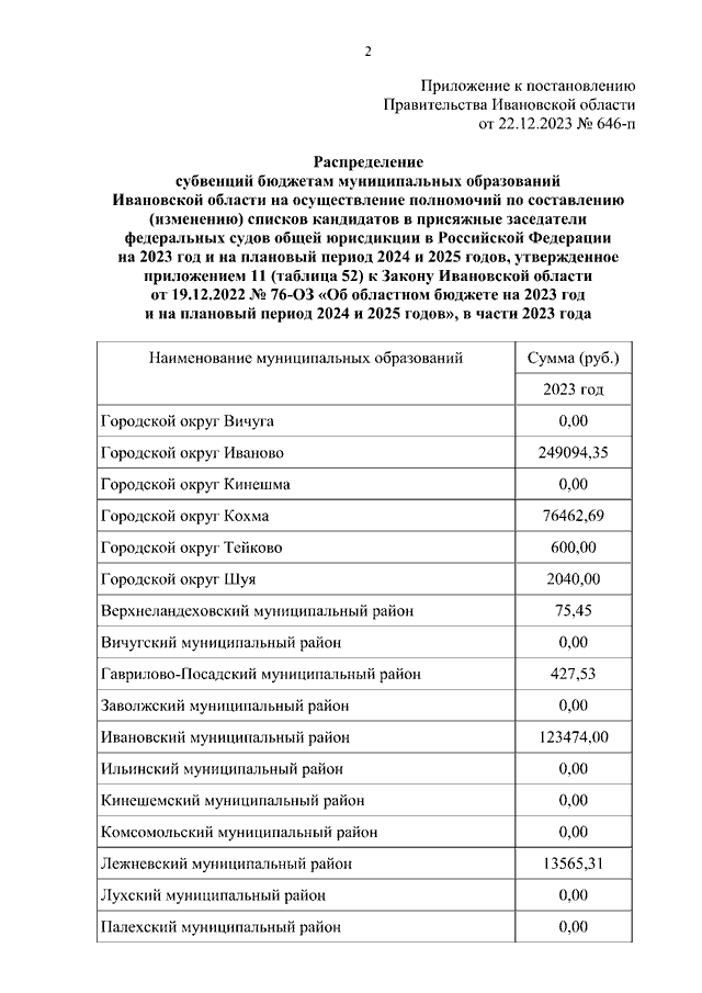 Постановление Правительства Ивановской области от 22.12.2023 N 646-п "О внесении изменения в распределение субвенций бюджетам муниципальных образований Ивановской области на осуществление полномочий по составлению (изменению) списков кандидатов в присяжные заседатели федеральных судов общей юрисдикции в Российской Федерации на 2023 год и на плановый период 2024 и 2025 годов"
