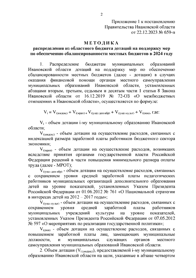 Постановление Правительства Ивановской области от 22.12.2023 N 659-п "О дотациях на поддержку мер по обеспечению сбалансированности местных бюджетов в 2024 году" (вместе с "Методикой распределения из областного бюджета дотаций на поддержку мер по обеспечению сбалансированности местных бюджетов в 2024 году", "Правилами предоставления из областного бюджета дотаций на поддержку мер по обеспечению сбалансированности местных бюджетов в 2024 году")