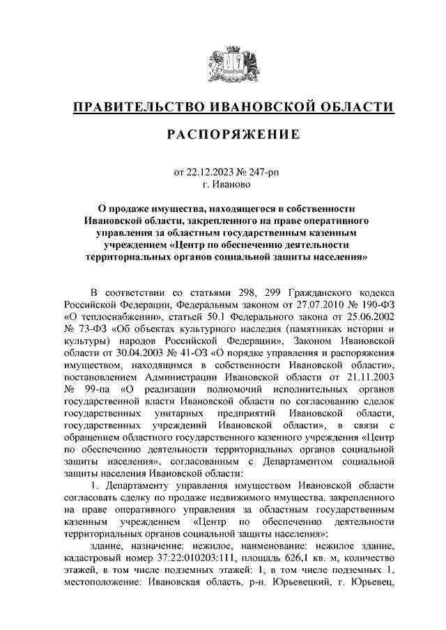 Распоряжение Правительства Ивановской области от 22.12.2023 N 247-рп "О продаже имущества, находящегося в собственности Ивановской области, закрепленного на праве оперативного управления за областным государственным казенным учреждением "Центр по обеспечению деятельности территориальных органов социальной защиты населения"