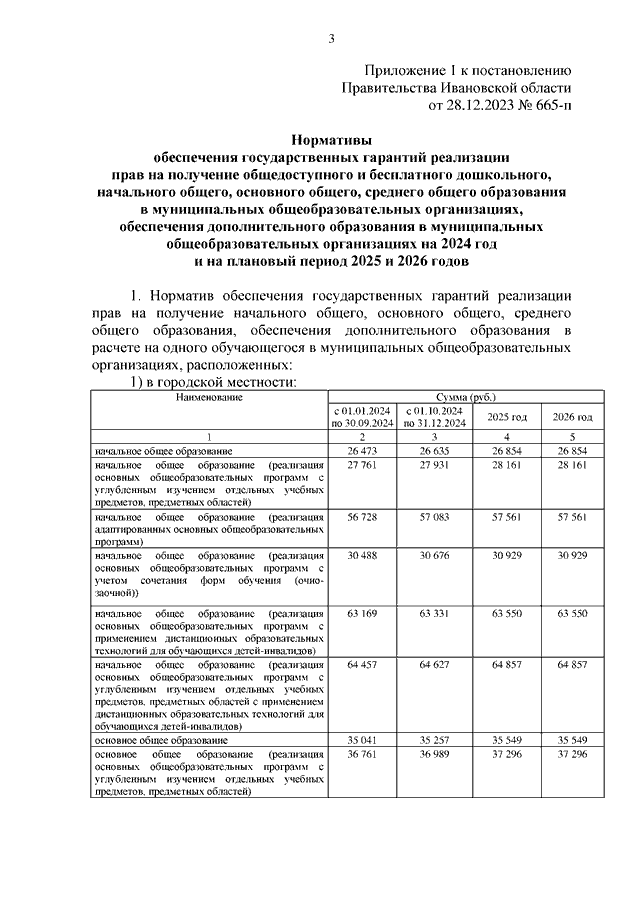 Постановление Правительства Ивановской области от 28.12.2023 N 665-п "Об утверждении нормативов обеспечения государственных гарантий реализации прав на получение общедоступного и бесплатного общего образования, обеспечения дополнительного образования в муниципальных образовательных организациях и возмещения затрат на финансовое обеспечение получения общего образования в частных образовательных организациях на 2024 год и на плановый период 2025 и 2026 годов" (вместе с "Нормативами обеспечения государственных гарантий реализации прав на получение общедоступного и бесплатного дошкольного, начального общего, основного общего, среднего общего образования в муниципальных общеобразовательных организациях, обеспечения дополнительного образования в муниципальных общеобразовательных организациях на 2024 год и на плановый период 2025 и 2026 годов", "Нормативами возмещения затрат на финансовое обеспечение получения дошкольного, начального общего, основного общего, среднего общего образования в частных общеобразовательных организациях, осуществляющих образовательную деятельность по имеющим государственную аккредитацию основным общеобразовательным программам, на 2024 год и на плановый период 2025 и 2026 годов", "Нормативами обеспечения государственных гарантий реализации прав на получение общедоступного и бесплатного дошкольного образования в муниципальных дошкольных образовательных организациях на 2024 год и на плановый период 2025 и 2026 годов", "Нормативами возмещения затрат на финансовое обеспечение получения дошкольного образования в частных дошкольных образовательных организациях на 2024 год и на плановый период 2025 и 2026 годов", "Перечнем малокомплектных муниципальных общеобразовательных организаций, для которых применяется норматив финансового обеспечения, учитывающий затраты, не зависящие от количества обучающихся, для расчета субвенций местным бюджетам в размере, необходимом для реализации основных общеобразовательных программ в части финансирования расходов на оплату труда работников общеобразовательных организаций, расходов на учебники, учебные пособия, средства обучения, игры, игрушки (за исключением расходов на содержание зданий и оплату коммунальных услуг, осуществляемых из местных бюджетов)")