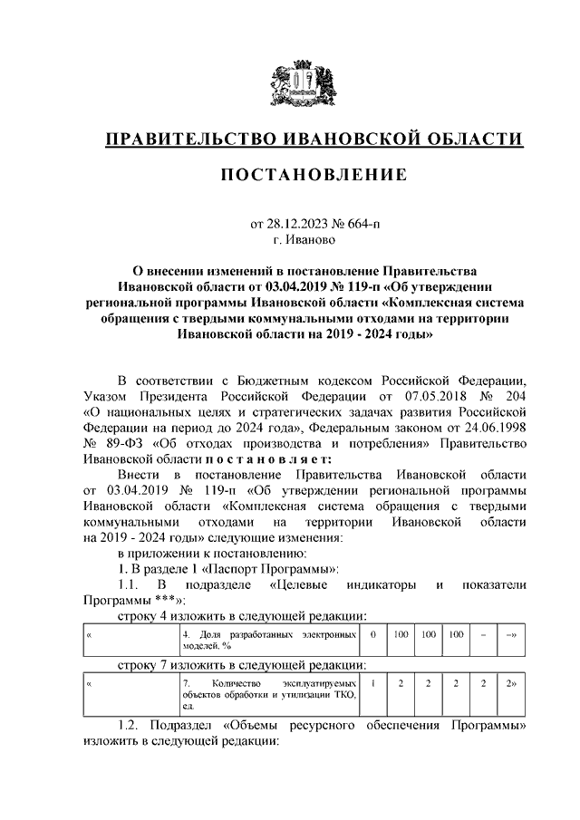 Постановление Правительства Ивановской области от 28.12.2023 N 664-п "О внесении изменений в постановление Правительства Ивановской области от 03.04.2019 N 119-п "Об утверждении региональной программы Ивановской области "Комплексная система обращения с твердыми коммунальными отходами на территории Ивановской области на 2019 - 2024 годы"