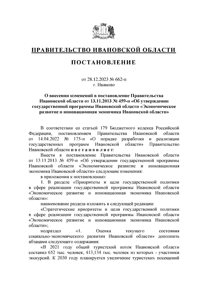 Постановление Правительства Ивановской области от 28.12.2023 N 662-п "О внесении изменений в постановление Правительства Ивановской области от 13.11.2013 N 459-п "Об утверждении государственной программы Ивановской области "Экономическое развитие и инновационная экономика Ивановской области" (вместе с "Перечнем объектов капитального строительства, мероприятий (укрупненных инвестиционных проектов), объектов недвижимости, реализуемых в рамках государственной программы "Экономическое развитие и инновационная экономика Ивановской области")
