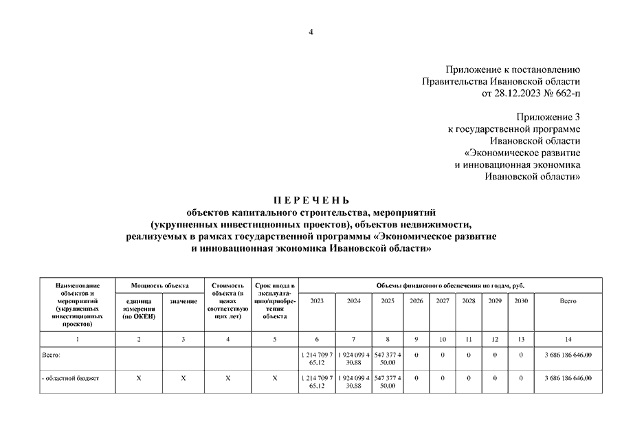 Постановление Правительства Ивановской области от 28.12.2023 N 662-п "О внесении изменений в постановление Правительства Ивановской области от 13.11.2013 N 459-п "Об утверждении государственной программы Ивановской области "Экономическое развитие и инновационная экономика Ивановской области" (вместе с "Перечнем объектов капитального строительства, мероприятий (укрупненных инвестиционных проектов), объектов недвижимости, реализуемых в рамках государственной программы "Экономическое развитие и инновационная экономика Ивановской области")