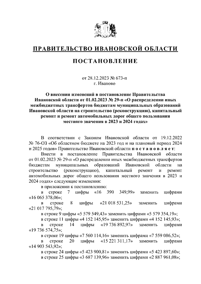 Постановление Правительства Ивановской области от 28.12.2023 N 673-п "О внесении изменений в постановление Правительства Ивановской области от 01.02.2023 N 29-п "О распределении иных межбюджетных трансфертов бюджетам муниципальных образований Ивановской области на строительство (реконструкцию), капитальный ремонт и ремонт автомобильных дорог общего пользования местного значения в 2023 и 2024 годах"