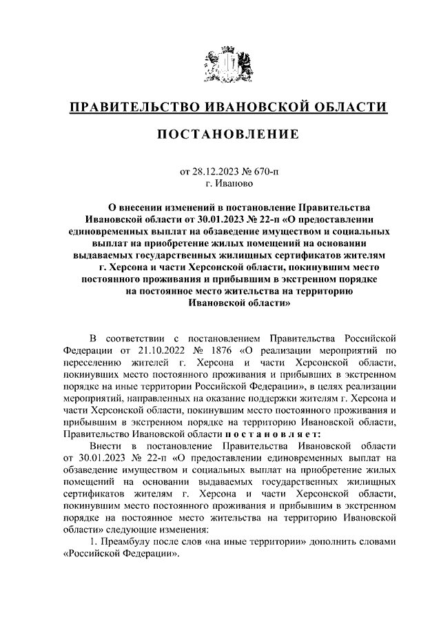Постановление Правительства Ивановской области от 28.12.2023 N 670-п "О внесении изменений в постановление Правительства Ивановской области от 30.01.2023 N 22-п "О предоставлении единовременных выплат на обзаведение имуществом и социальных выплат на приобретение жилых помещений на основании выдаваемых государственных жилищных сертификатов жителям г. Херсона и части Херсонской области, покинувшим место постоянного проживания и прибывшим в экстренном порядке на постоянное место жительства на территорию Ивановской области"
