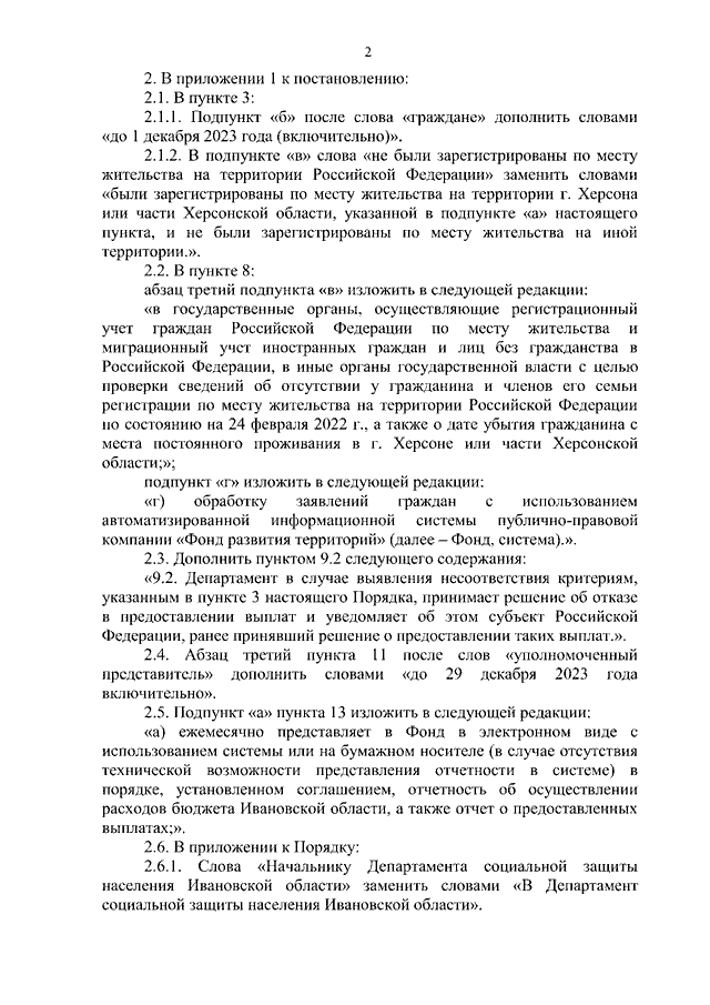 Постановление Правительства Ивановской области от 28.12.2023 N 670-п "О внесении изменений в постановление Правительства Ивановской области от 30.01.2023 N 22-п "О предоставлении единовременных выплат на обзаведение имуществом и социальных выплат на приобретение жилых помещений на основании выдаваемых государственных жилищных сертификатов жителям г. Херсона и части Херсонской области, покинувшим место постоянного проживания и прибывшим в экстренном порядке на постоянное место жительства на территорию Ивановской области"