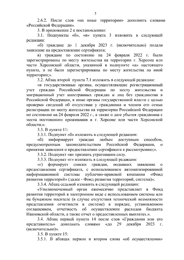 Постановление Правительства Ивановской области от 28.12.2023 N 670-п "О внесении изменений в постановление Правительства Ивановской области от 30.01.2023 N 22-п "О предоставлении единовременных выплат на обзаведение имуществом и социальных выплат на приобретение жилых помещений на основании выдаваемых государственных жилищных сертификатов жителям г. Херсона и части Херсонской области, покинувшим место постоянного проживания и прибывшим в экстренном порядке на постоянное место жительства на территорию Ивановской области"