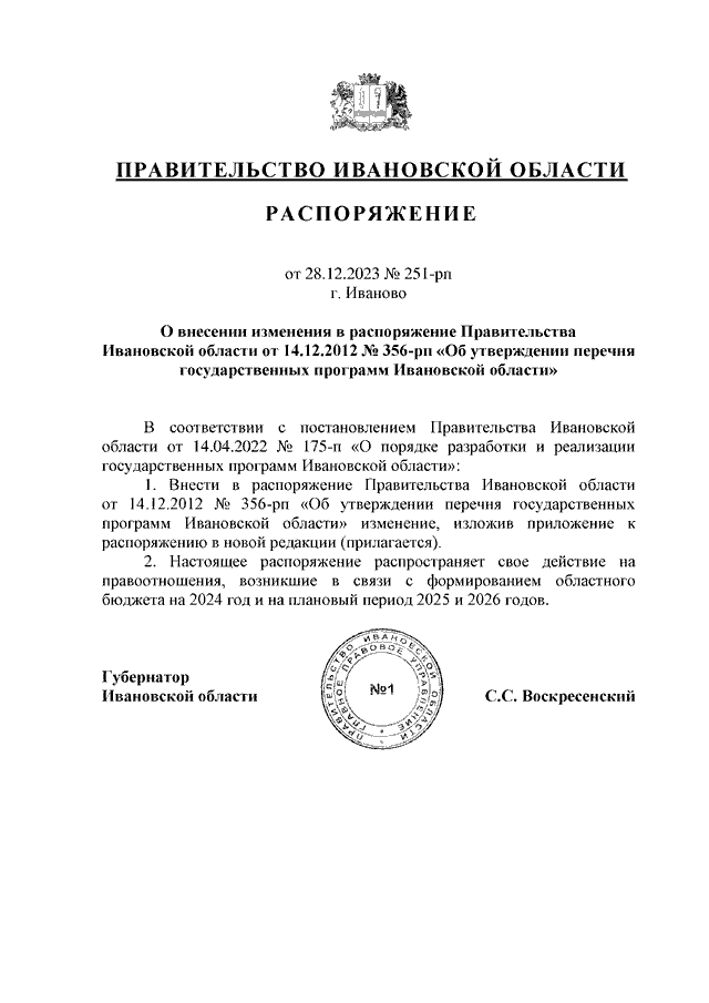 Распоряжение Правительства Ивановской области от 28.12.2023 N 251-рп "О внесении изменения в распоряжение Правительства Ивановской области от 14.12.2012 N 356-рп "Об утверждении перечня государственных программ Ивановской области"
