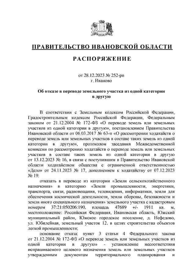 Распоряжение Правительства Ивановской области от 28.12.2023 N 252-рп "Об отказе в переводе земельного участка из одной категории в другую"