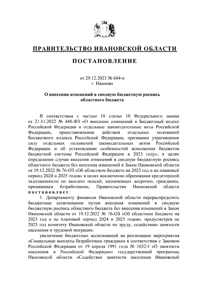 Постановление Правительства Ивановской области от 29.12.2023 N 684-п "О внесении изменений в сводную бюджетную роспись областного бюджета"