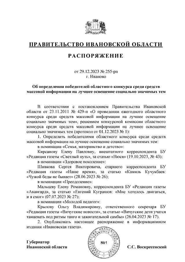 Распоряжение Правительства Ивановской области от 29.12.2023 N 255-рп "Об определении победителей областного конкурса среди средств массовой информации на лучшее освещение социально значимых тем"