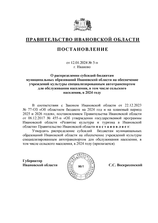 Постановление Правительства Ивановской области от 12.01.2024 N 5-п "О распределении субсидий бюджетам муниципальных образований Ивановской области на обеспечение учреждений культуры специализированным автотранспортом для обслуживания населения, в том числе сельского населения, в 2024 году"