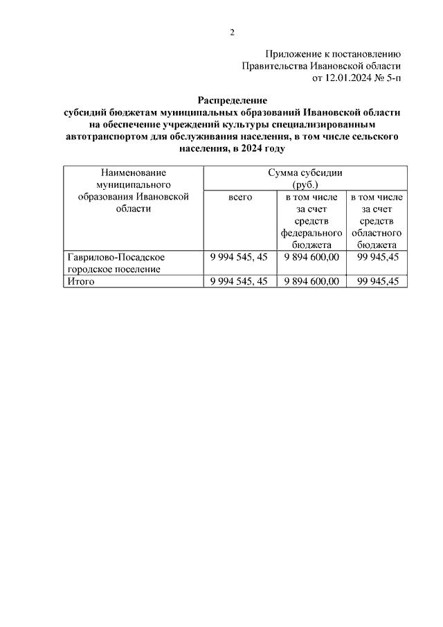Постановление Правительства Ивановской области от 12.01.2024 N 5-п "О распределении субсидий бюджетам муниципальных образований Ивановской области на обеспечение учреждений культуры специализированным автотранспортом для обслуживания населения, в том числе сельского населения, в 2024 году"