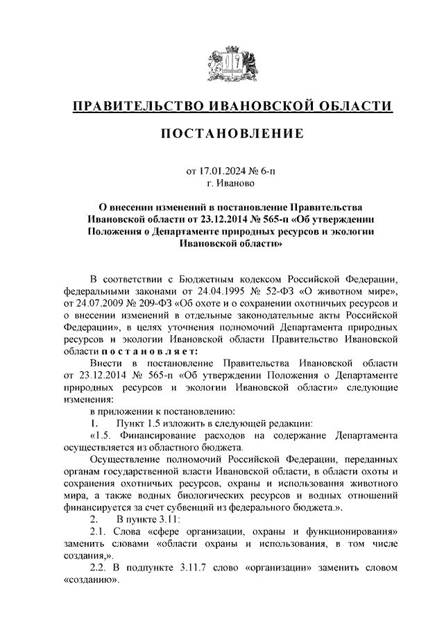 Постановление Правительства Ивановской области от 17.01.2024 N 6-п "О внесении изменений в постановление Правительства Ивановской области от 23.12.2014 N 565-п "Об утверждении Положения о Департаменте природных ресурсов и экологии Ивановской области"