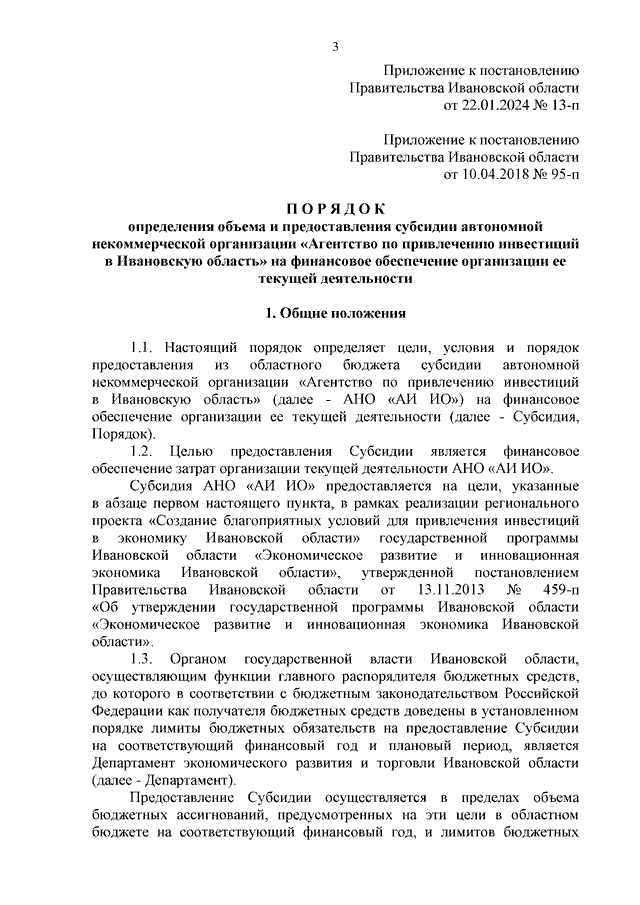 Постановление Правительства Ивановской области от 22.01.2024 N 13-п "О внесении изменений в постановление Правительства Ивановской области от 10.04.2018 N 95-п "Об утверждении Порядка определения объема и предоставления субсидии автономной некоммерческой организации "Агентство по привлечению инвестиций в Ивановскую область" на финансовое обеспечение организации ее текущей деятельности"