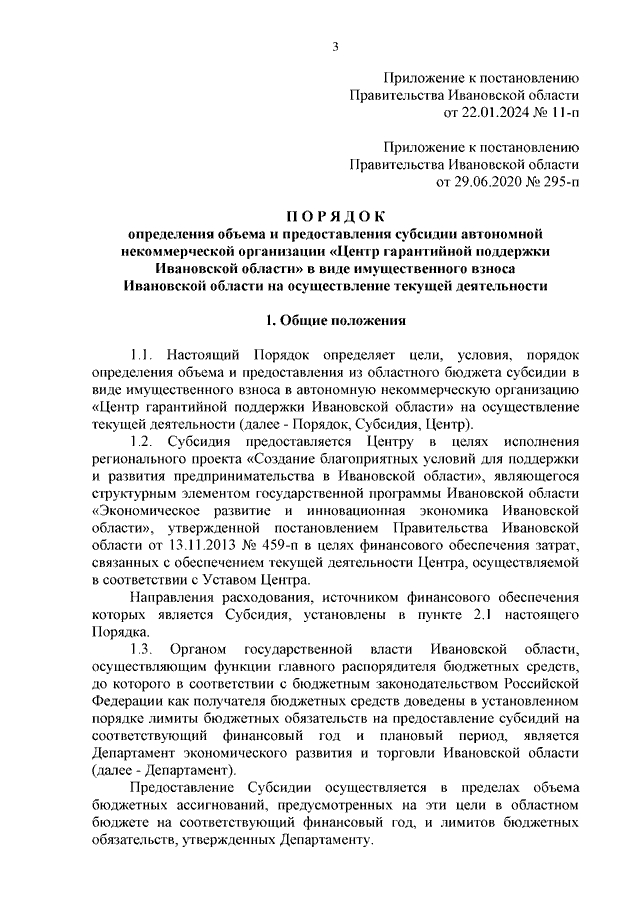 Постановление Правительства Ивановской области от 22.01.2024 N 11-п "О внесении изменений в постановление Правительства Ивановской области от 29.06.2020 N 295-п "Об утверждении Порядка определения объема и предоставления субсидии автономной некоммерческой организации "Центр гарантийной поддержки Ивановской области" в виде имущественного взноса Ивановской области на осуществление текущей деятельности"