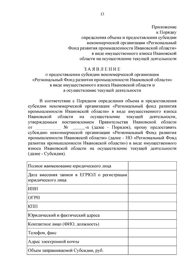 Постановление Правительства Ивановской области от 22.01.2024 N 10-п "О внесении изменений в постановление Правительства Ивановской области от 08.04.2019 N 121-п "Об утверждении Порядка определения объема и предоставления субсидии некоммерческой организации "Региональный Фонд развития промышленности Ивановской области" в виде имущественного взноса Ивановской области на осуществление текущей деятельности"
