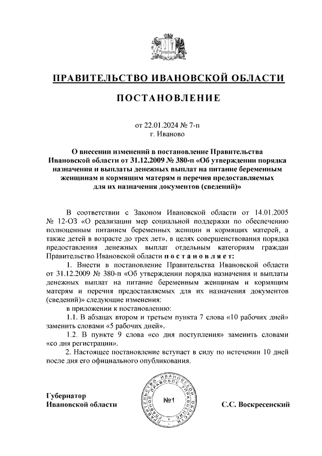 Постановление Правительства Ивановской области от 22.01.2024 N 7-п "О внесении изменений в постановление Правительства Ивановской области от 31.12.2009 N 380-п "Об утверждении порядка назначения и выплаты денежных выплат на питание беременным женщинам и кормящим матерям и перечня предоставляемых для их назначения документов (сведений)"