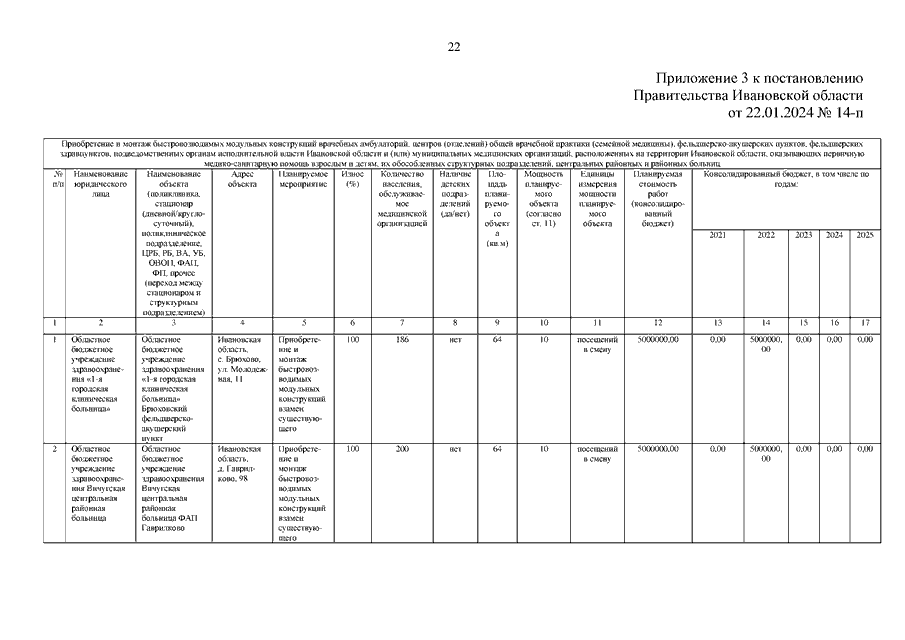 Постановление Правительства Ивановской области от 22.01.2024 N 14-п "О внесении изменений в постановление Правительства Ивановской области от 15.12.2020 N 626-п "Об утверждении Региональной программы модернизации первичного звена здравоохранения Ивановской области на 2021 - 2025 годы"