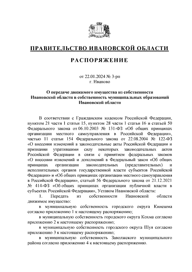 Распоряжение Правительства Ивановской области от 22.01.2024 N 3-рп "О передаче движимого имущества из собственности Ивановской области в собственность муниципальных образований Ивановской области"