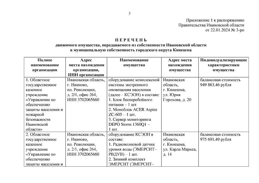 Распоряжение Правительства Ивановской области от 22.01.2024 N 3-рп "О передаче движимого имущества из собственности Ивановской области в собственность муниципальных образований Ивановской области"