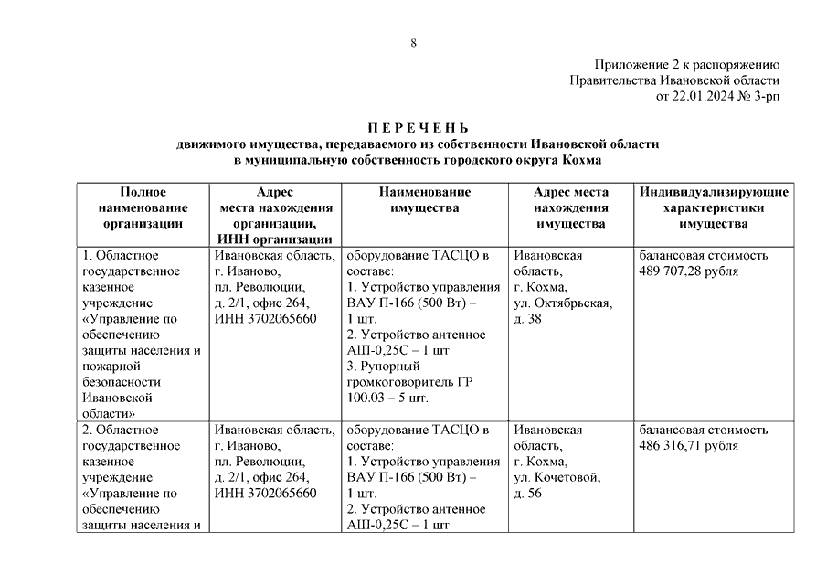 Распоряжение Правительства Ивановской области от 22.01.2024 N 3-рп "О передаче движимого имущества из собственности Ивановской области в собственность муниципальных образований Ивановской области"