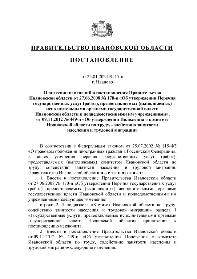 Постановление Правительства Ивановской области от 25.01.2024 N 15-п "О внесении изменений в постановления Правительства Ивановской области от 27.06.2008 N 170-п "Об утверждении Перечня государственных услуг (работ), предоставляемых (выполняемых) исполнительными органами государственной власти Ивановской области и подведомственными им учреждениями", от 09.11.2012 N 449-п "Об утверждении Положения о комитете Ивановской области по труду, содействию занятости населения и трудовой миграции"