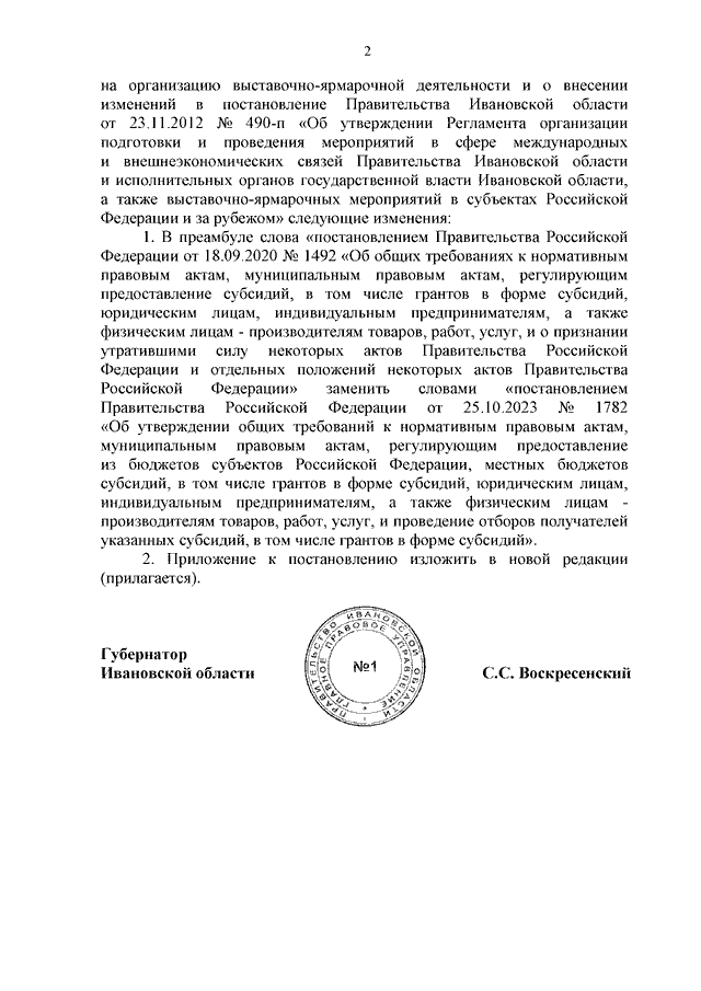 Постановление Правительства Ивановской области от 25.01.2024 N 17-п "О внесении изменений в постановление Правительства Ивановской области от 07.02.2018 N 27-п "Об утверждении Порядка определения объема и предоставления субсидии автономной некоммерческой организации "Агентство по привлечению инвестиций в Ивановскую область" на организацию выставочно-ярмарочной деятельности и о внесении изменений в постановление Правительства Ивановской области от 23.11.2012 N 490-п "Об утверждении Регламента организации подготовки и проведения мероприятий в сфере международных и внешнеэкономических связей Правительства Ивановской области и исполнительных органов государственной власти Ивановской области, а также выставочно-ярмарочных мероприятий в субъектах Российской Федерации и за рубежом"