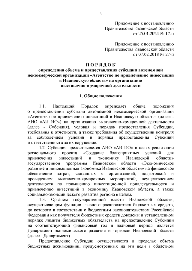 Постановление Правительства Ивановской области от 25.01.2024 N 17-п "О внесении изменений в постановление Правительства Ивановской области от 07.02.2018 N 27-п "Об утверждении Порядка определения объема и предоставления субсидии автономной некоммерческой организации "Агентство по привлечению инвестиций в Ивановскую область" на организацию выставочно-ярмарочной деятельности и о внесении изменений в постановление Правительства Ивановской области от 23.11.2012 N 490-п "Об утверждении Регламента организации подготовки и проведения мероприятий в сфере международных и внешнеэкономических связей Правительства Ивановской области и исполнительных органов государственной власти Ивановской области, а также выставочно-ярмарочных мероприятий в субъектах Российской Федерации и за рубежом"