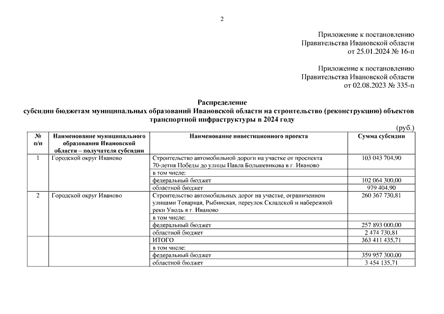 Постановление Правительства Ивановской области от 25.01.2024 N 16-п "О внесении изменения в постановление Правительства Ивановской области от 02.08.2023 N 335-п "О распределении субсидии бюджетам муниципальных образований Ивановской области на строительство (реконструкцию) объектов транспортной инфраструктуры в 2024 году"
