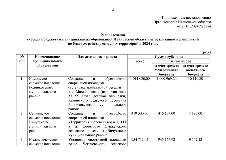 Постановление Правительства Ивановской области от 25.01.2024 N 18-п "О распределении субсидий бюджетам муниципальных образований Ивановской области на реализацию мероприятий по благоустройству сельских территорий в 2024 году"