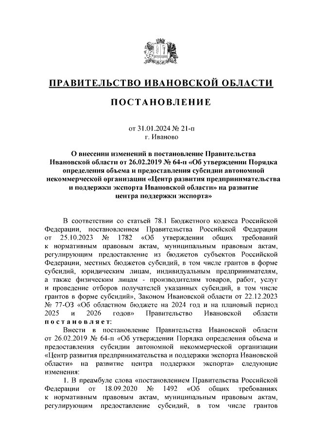 Постановление Правительства Ивановской области от 31.01.2024 N 21-п "О внесении изменений в постановление Правительства Ивановской области от 26.02.2019 N 64-п "Об утверждении Порядка определения объема и предоставления субсидии автономной некоммерческой организации "Центр развития предпринимательства и поддержки экспорта Ивановской области" на развитие центра поддержки экспорта"