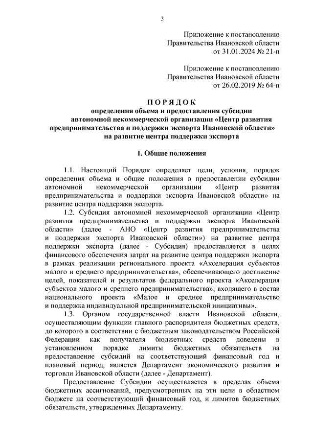 Постановление Правительства Ивановской области от 31.01.2024 N 21-п "О внесении изменений в постановление Правительства Ивановской области от 26.02.2019 N 64-п "Об утверждении Порядка определения объема и предоставления субсидии автономной некоммерческой организации "Центр развития предпринимательства и поддержки экспорта Ивановской области" на развитие центра поддержки экспорта"