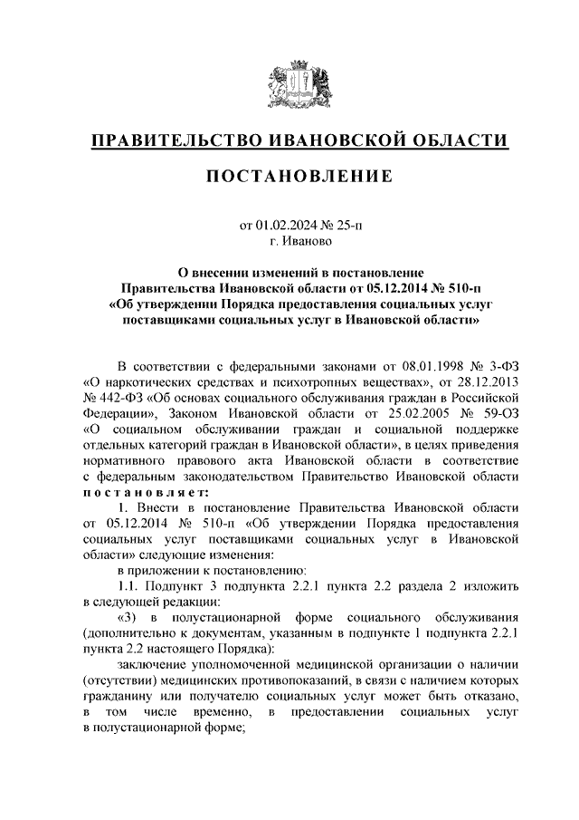 Постановление Правительства Ивановской области от 01.02.2024 N 25-п "О внесении изменений в постановление Правительства Ивановской области от 05.12.2014 N 510-п "Об утверждении Порядка предоставления социальных услуг поставщиками социальных услуг в Ивановской области"