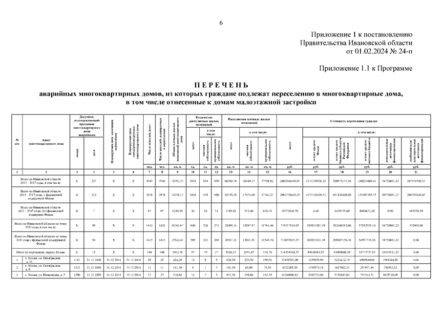 Постановление Правительства Ивановской области от 01.02.2024 N 24-п "О внесении изменений в постановление Правительства Ивановской области от 15.04.2013 N 134-п "Об утверждении региональной адресной программы "Переселение граждан из аварийного жилищного фонда на территории Ивановской области на 2013 - 2018 годы" (вместе с "Перечнем аварийных многоквартирных домов, из которых граждане подлежат переселению в многоквартирные дома, в том числе отнесенные к домам малоэтажной застройки", "Реестром аварийных многоквартирных домов по способам переселения, из которых граждане подлежат переселению в многоквартирные дома, в том числе отнесенные к домам малоэтажной застройки")